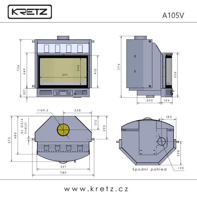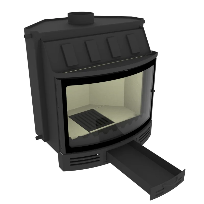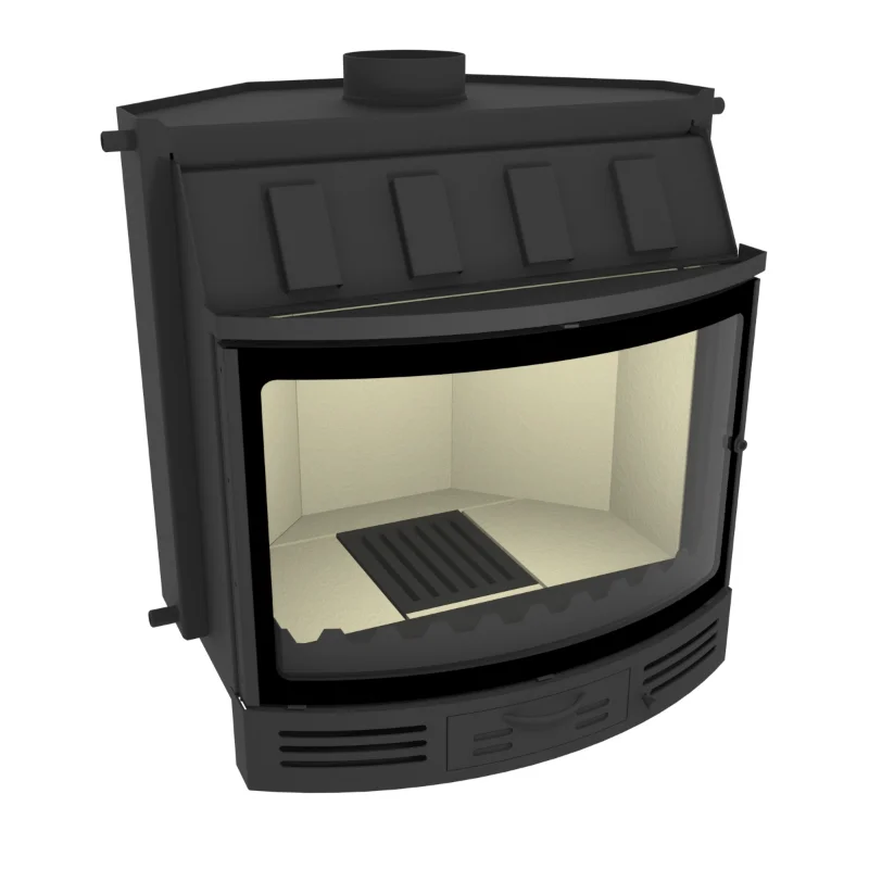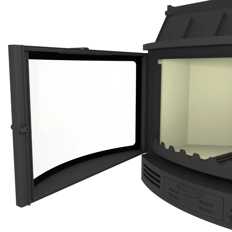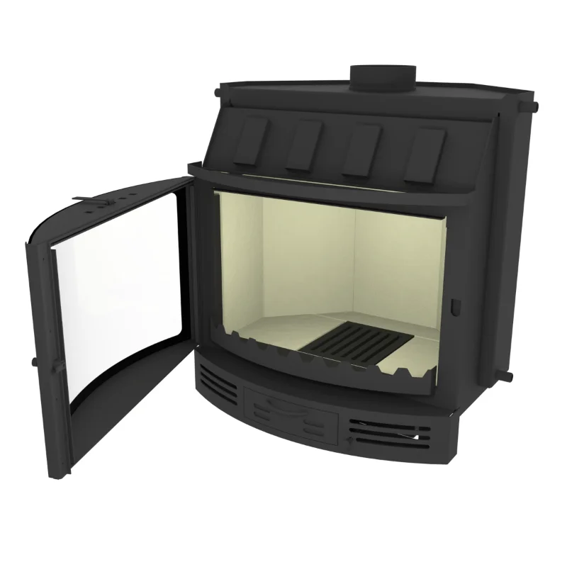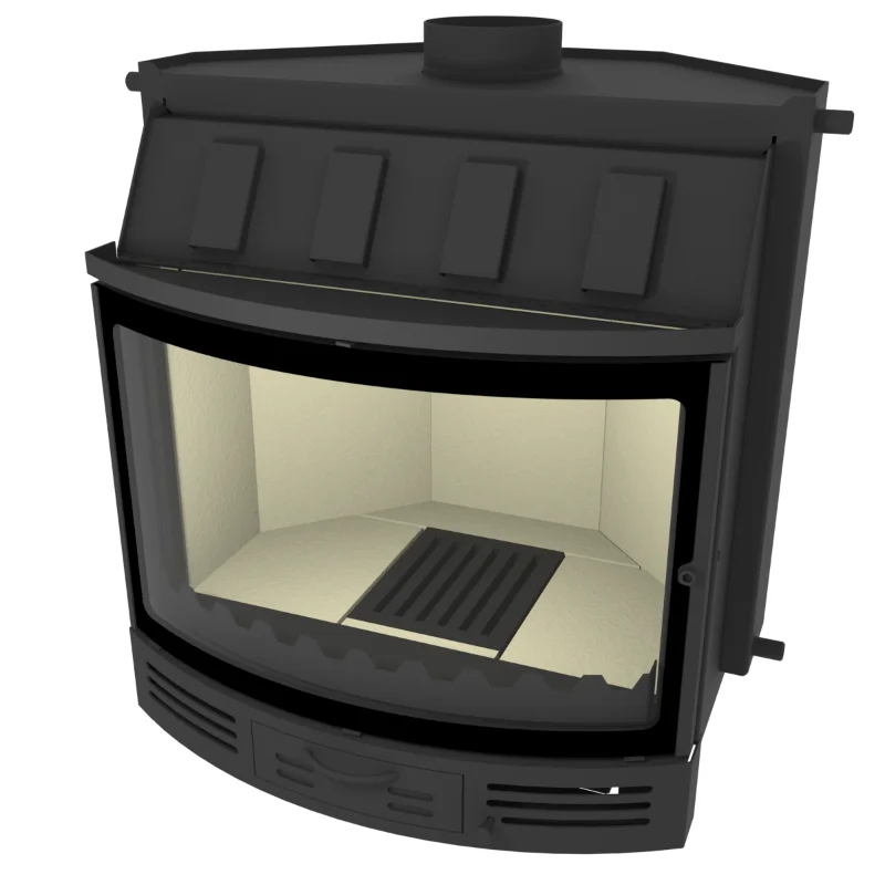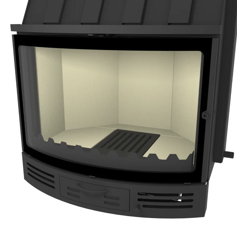 Ocelová krbová vložka teplovodní se šamotovou vyzdívkou. Otvírání do boku (klička dveří vpravo). Samočistící sklo - oplachování proudem sekundárního vzduchu.