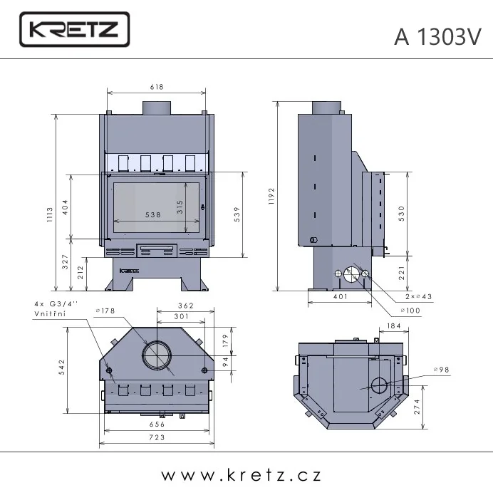 Ocelová krbová vložka teplovodní s litinovým topeništěm. Otvírání do boku (klička dveří vpravo). Samočistící sklo - oplachování proudem sekundárního vzduchu.