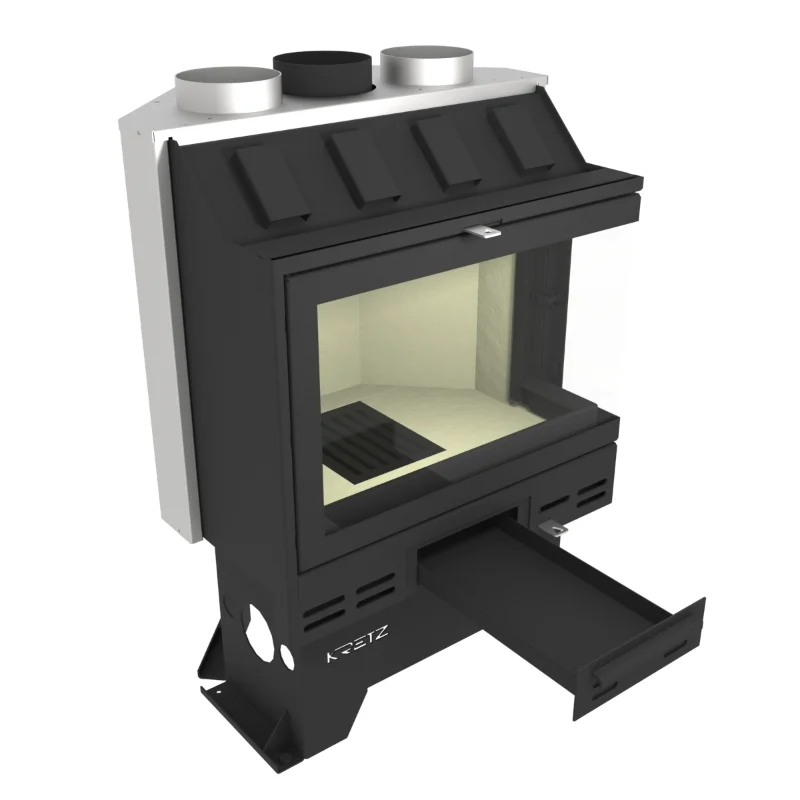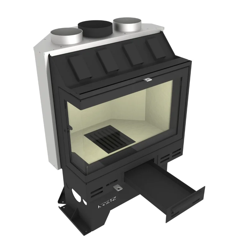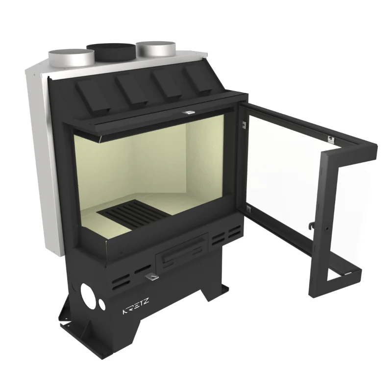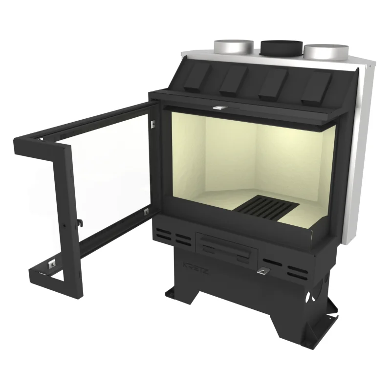 Ocelová krbová vložka dvouplášťová se šamotovou vyzdívkou. Otvírání do boku. Samočistící sklo - jednoduchá regulace oplachu skla sekundárním vzduchem.