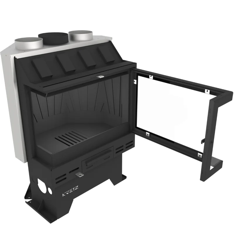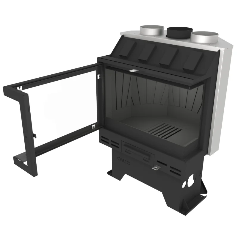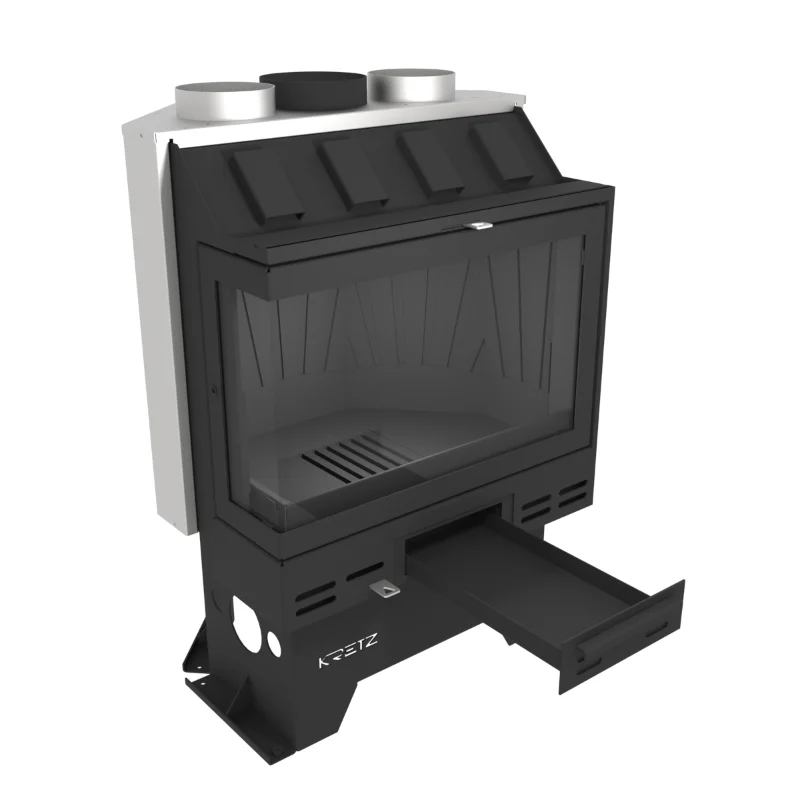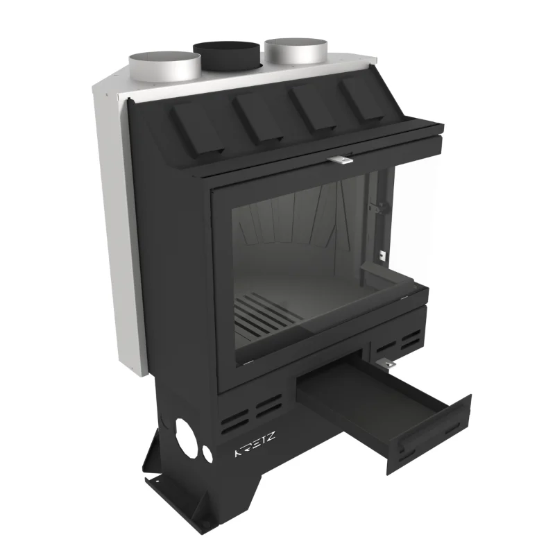 Ocelová krbová vložka dvouplášťová s litinovým topeništěm. Otvírání do boku. Samočistící sklo - jednoduchá regulace oplachu skla sekundárním vzduchem.