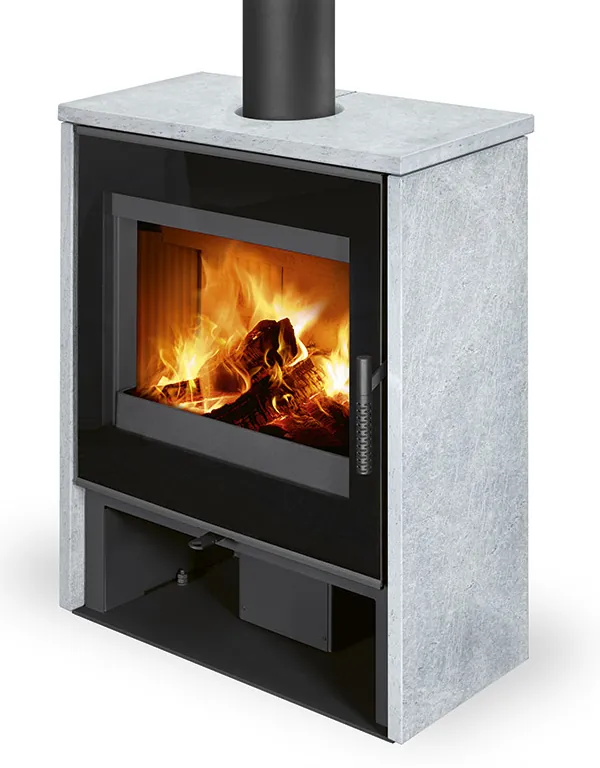 Dvouplášťová (konvekční) krbová kamna s velkoplošným elegantním potištěným sklem dvířek. Ocelové opláštění s kamenem na bocích a horní desce. Jaký je rozdíl mezi sáláním a konvekcí ![]()