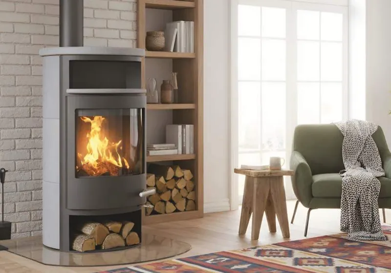 Dvouplášťová teplovzdušná (konvekční) kamna s kamenným obkladem.