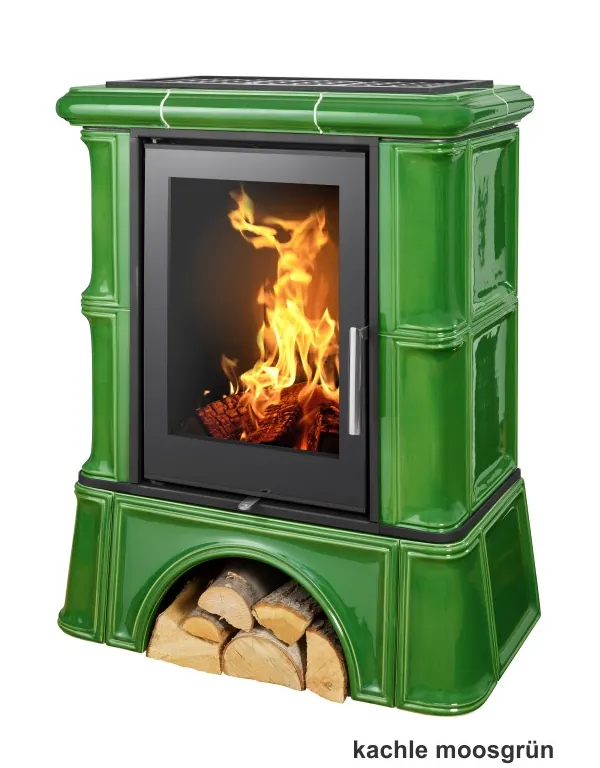 Kachlová dvouplášťová teplovzdušná (konvekční) kamna s celoskleněnými dvířky a šamotovým topeništěm.