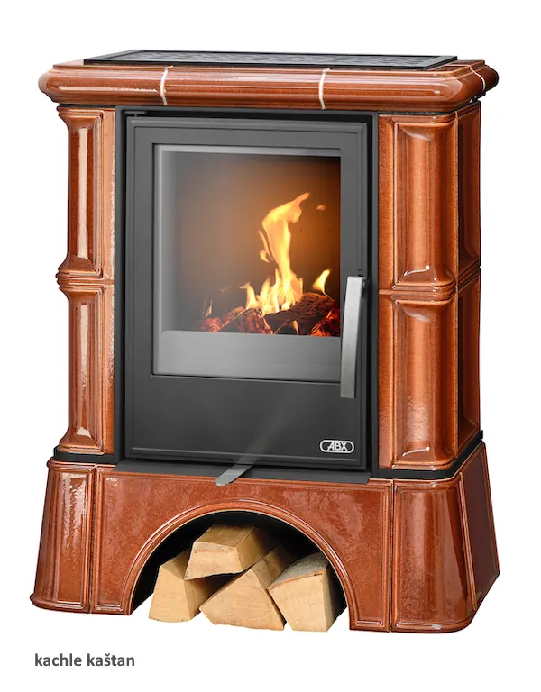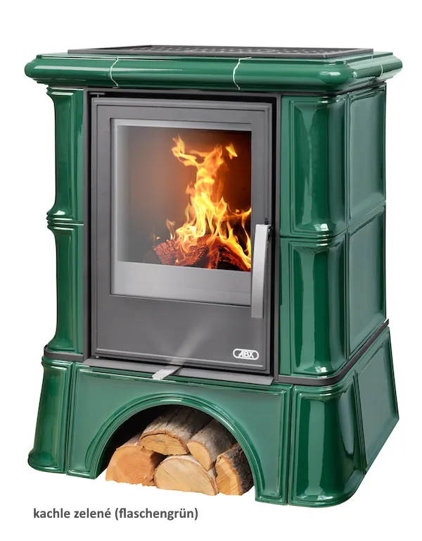 Kachlová dvouplášťová teplovzdušná (konvekční) kamna s teplovodním výměníkem.