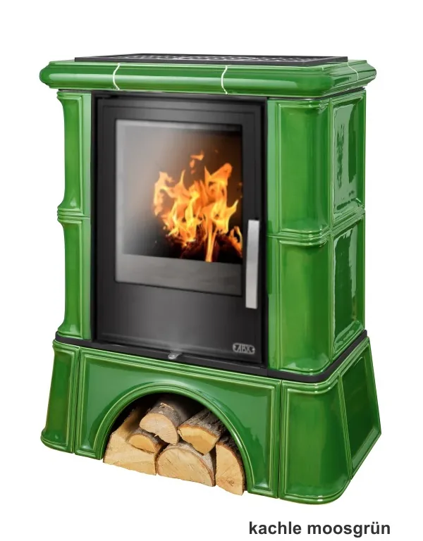Kachlová dvouplášťová teplovzdušná (konvekční) kamna s kachlovým soklem.