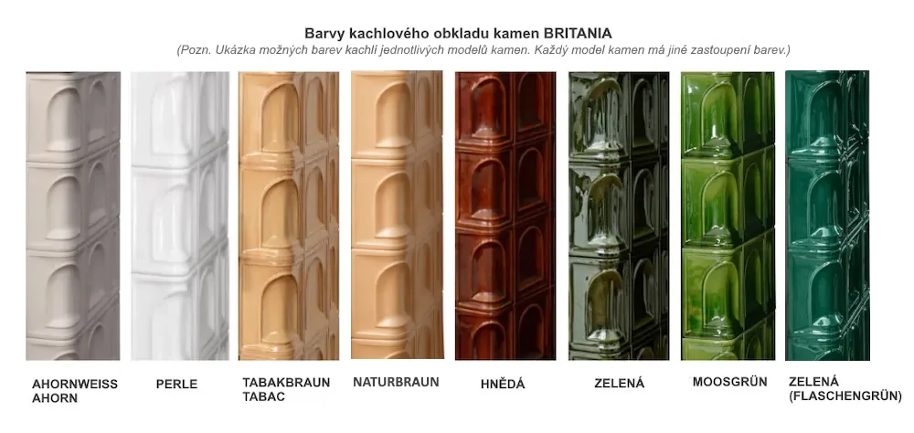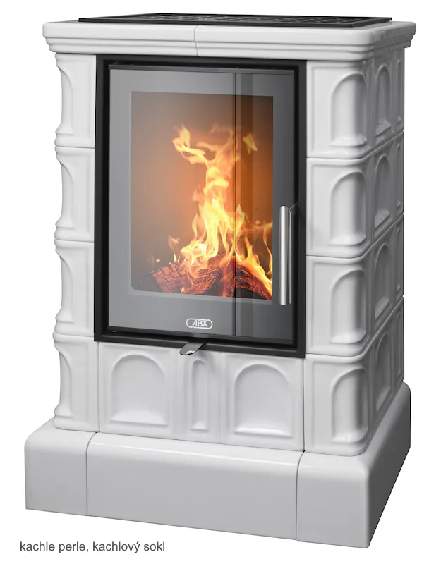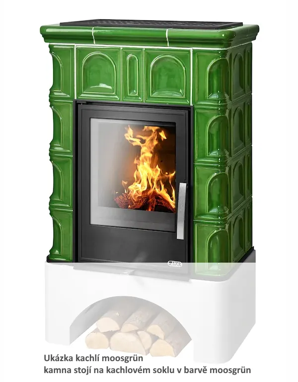 Kachlová dvouplášťová teplovzdušná (konvekční) kamna s designovými dvířky. Ocelové topeniště má šamotovou vyzdívku a litinový rošt.
