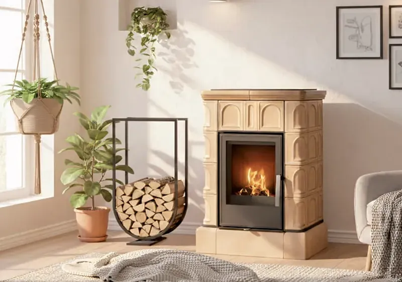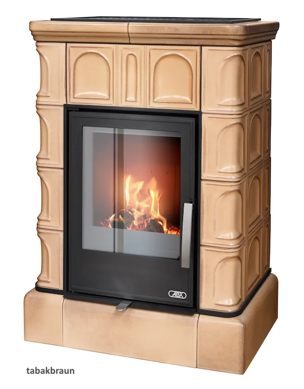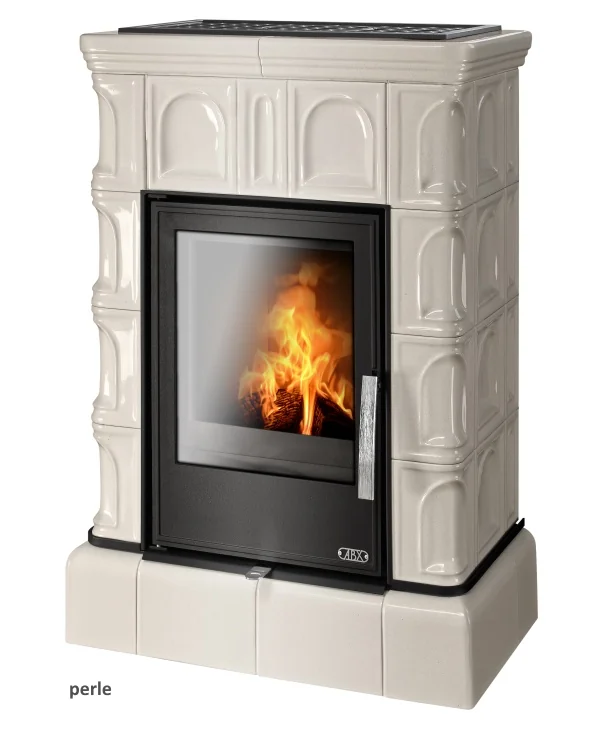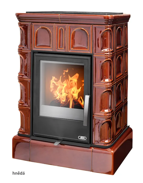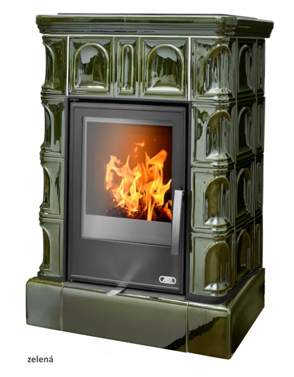 Kachlová dvouplášťová teplovzdušná (konvekční) kamna s teplovodním výměníkem.