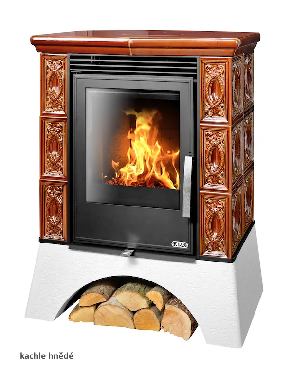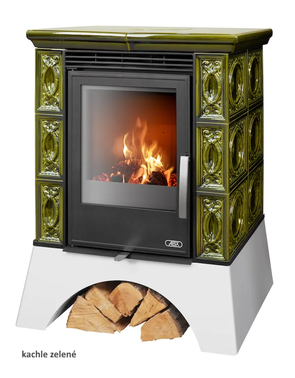 Kachlová dvouplášťová (konvekční) krbová kamna s litinovými dvířky a se vermikulitovou vyzdívku topeniště.
