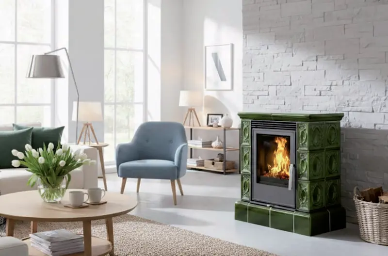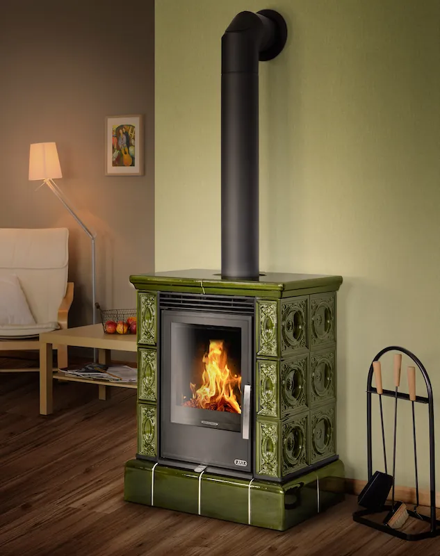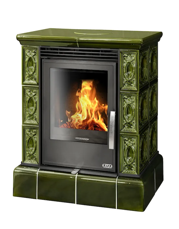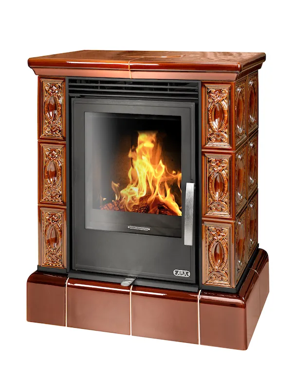 Kachlová dvouplášťová (konvekční) krbová kamna s litinovými dvířky a se vermikulitovou vyzdívku topeniště.