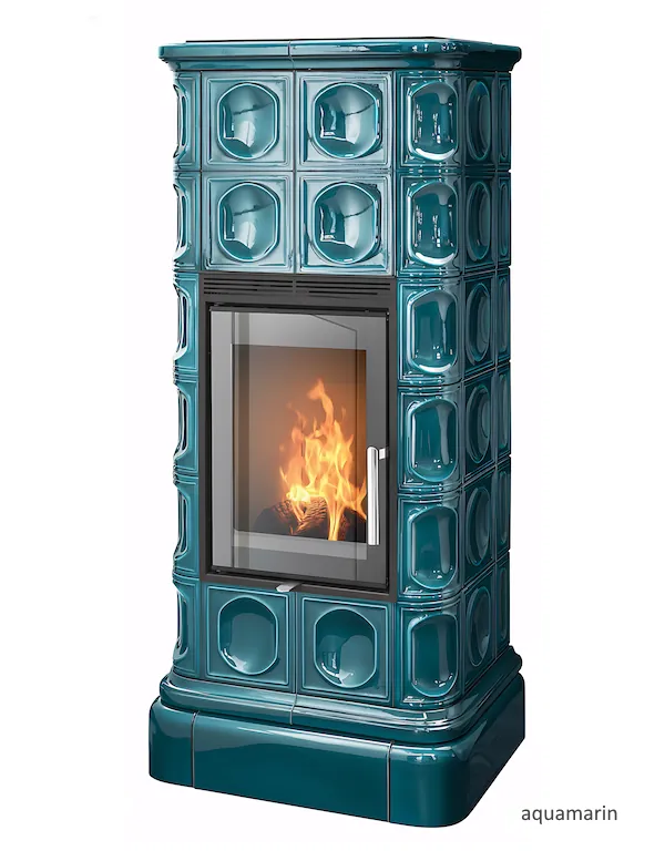 Kachlová dvouplášťová teplovzdušná (konvekční) kamna s celoskleněnými dvířky.