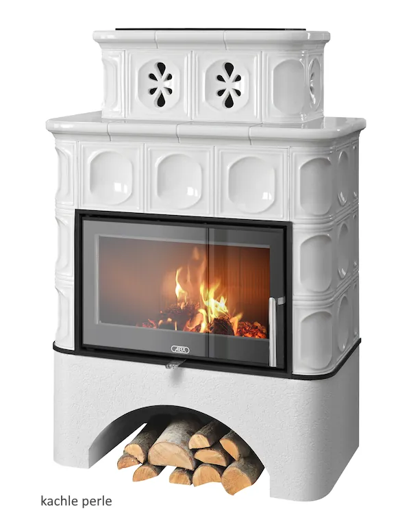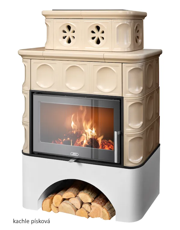Kachlová dvouplášťová teplovzdušná (konvekční) kamna s celoskleněnými dvířky.