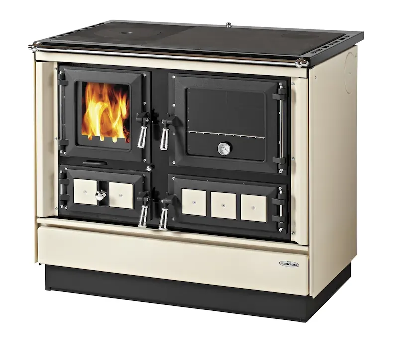 Topeniště je šamotové a má litinový otočný rošt, který slouží k roštování a jehož otočením se pohodlně vyklopí zbytky popela do popelníku. Vstupní otvor je u tohoto typu větších rozměrů a proto je možné do topeniště vkládat polena o maximální délce 45 cm a průměru 19 cm. Do topeniště je přiváděn primární i sekundární vzduch. Funkce trouby „pečení“ se jednoduše ovládá na rámu plotny.V prosklených dvířkách trouby je teploměr. Pod troubou je rozměrná zásuvka na příruční zásobu paliva. Tato zásuvka je upevněna na kolejničkách s kolečky, takže i při naplněné zásuvce se lehce vysunuje.Dodávané příslušenství: 1 hluboký pekáč, 1 mřížka pečící trouby, kuták a rukavice. Pro zabudování sporáku do kuchyňské linky je možné použít ochlazovací panely. Provedení sporáku: smaltovaný plášť béžový s chromovanými doplňky, béžový smaltovaný rám kolem plotny, plotna je ocelová broušená, vývody kouřovodu jsou vpravo, trouba vpravo, přikládací dvířka pak vlevo.