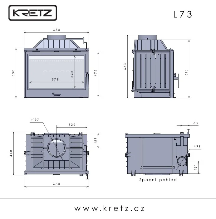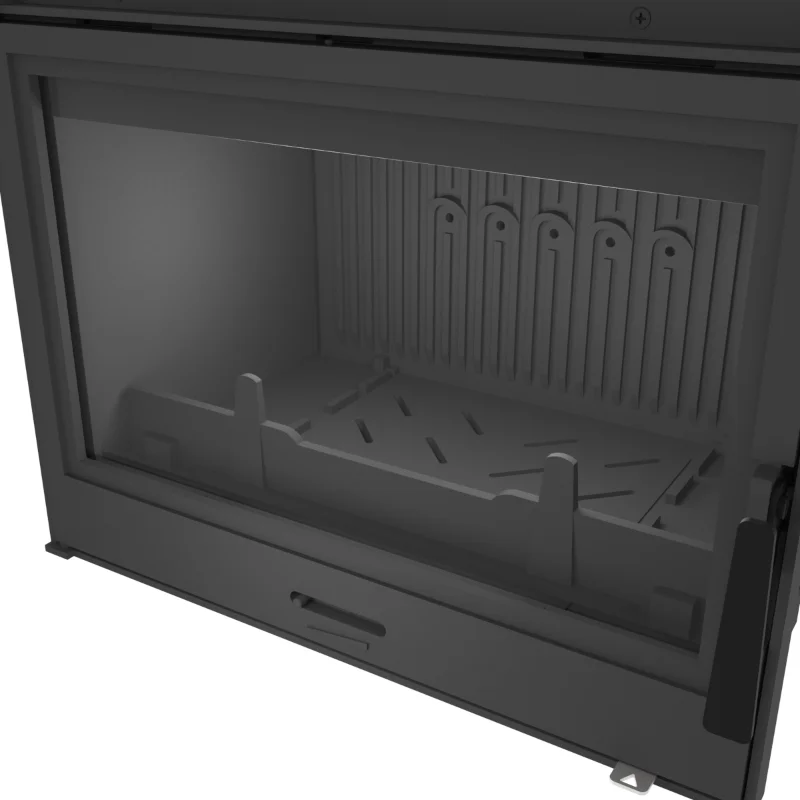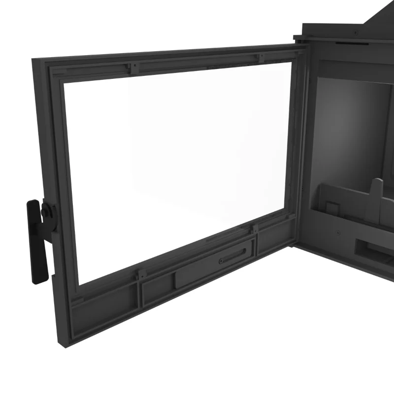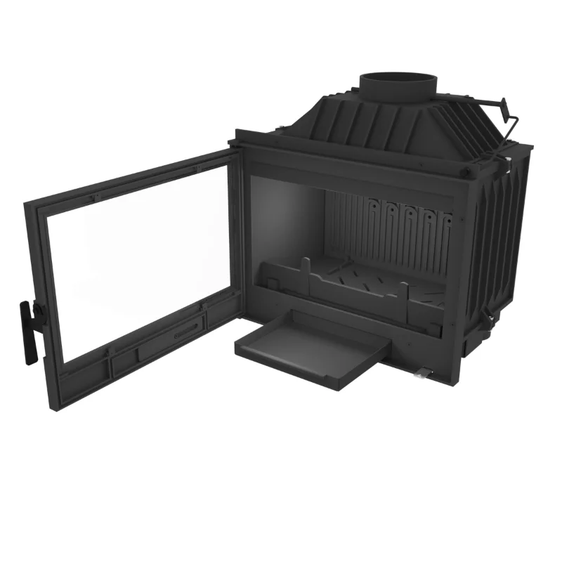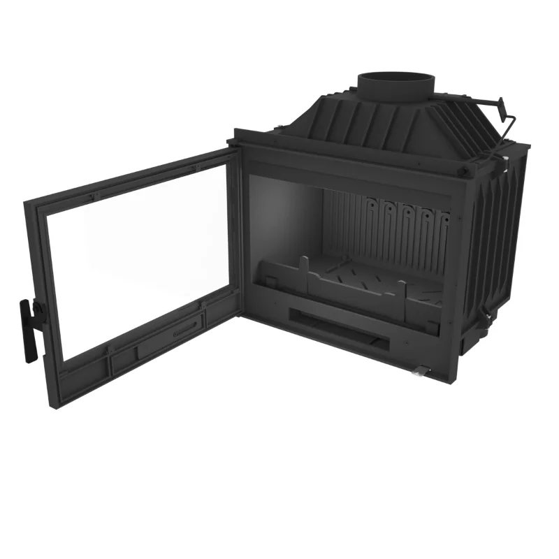 Litinová jednoplášťová krbová vložka. Rovné prosklení. Otvírání do boku (klička dveří vpravo, panty vlevo). Samočistící sklo - oplachování proudem sekundárního vzduchu.
