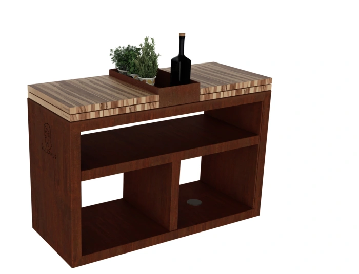 Vysoký a prodloužený podstavec Masterbucher s bukovou deskou. Na masivní dřevěné desce snadno naporcujete potraviny a vše si pohodlně připravíte. V podstavci najdete místo pro dřevo i přihrádku na odložení nádobí nebo surovin.
