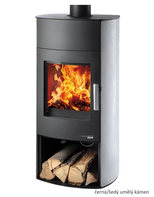 Dvouplášťová teplovzdušná (konvekční) kamna luxusní řady PREMIUM s velkým prosklením, na bocích šedý umělý kámen nebo přírodní kámen. Kamna je možné vybavit akumulační sadou, a tak využijete sálavé teplo na maximum.