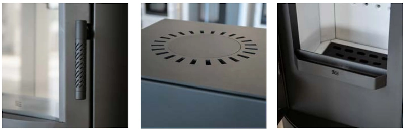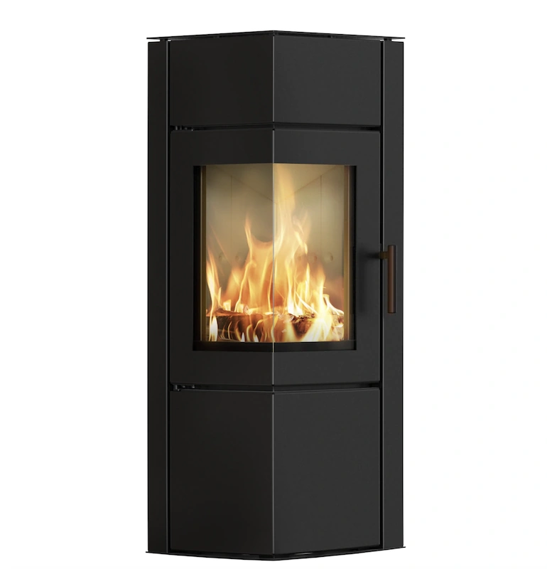 Ocelová dvouplášťová konvekční kamna. Rohová kamna vhodná pro nízkoenergetické nebo dobře utěsněné domy s rekuperací.