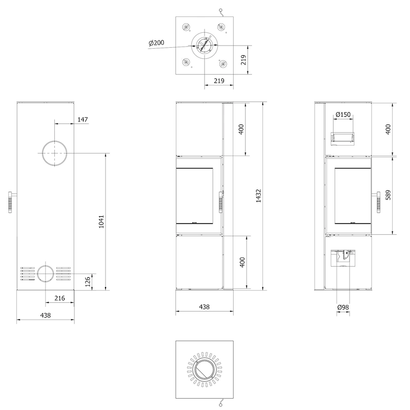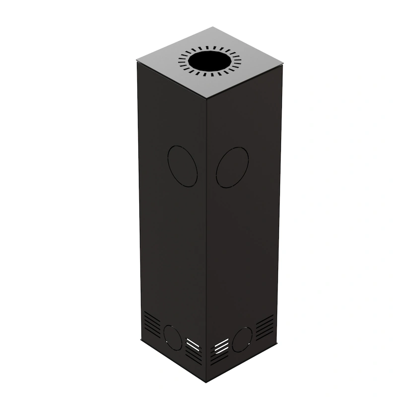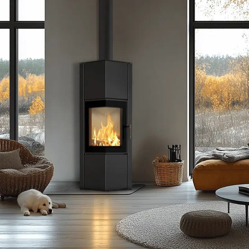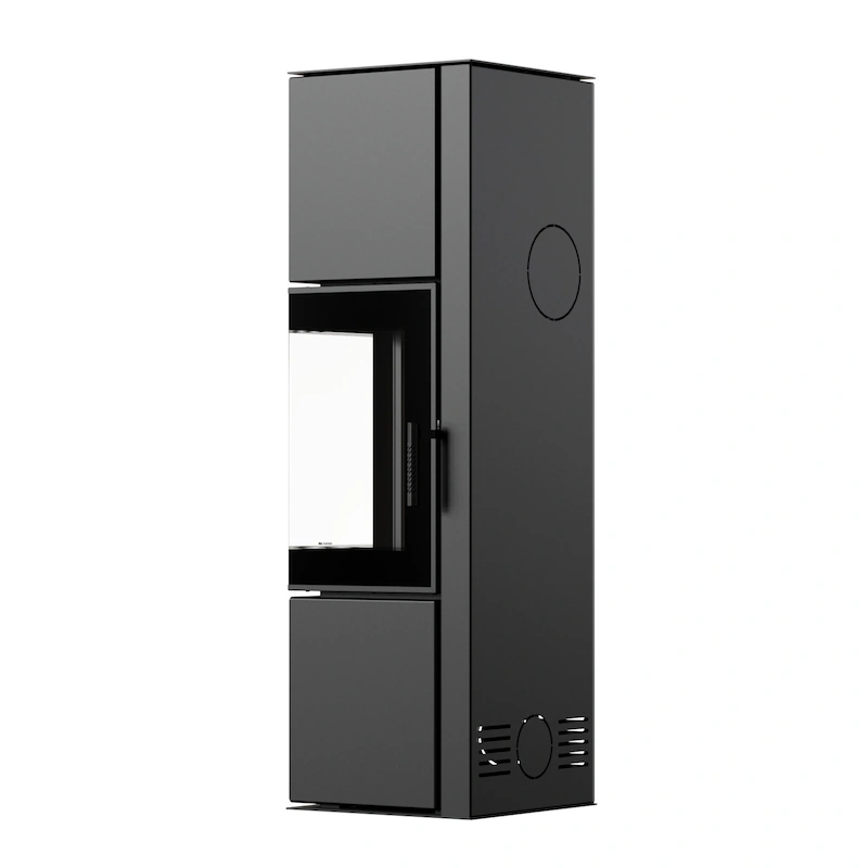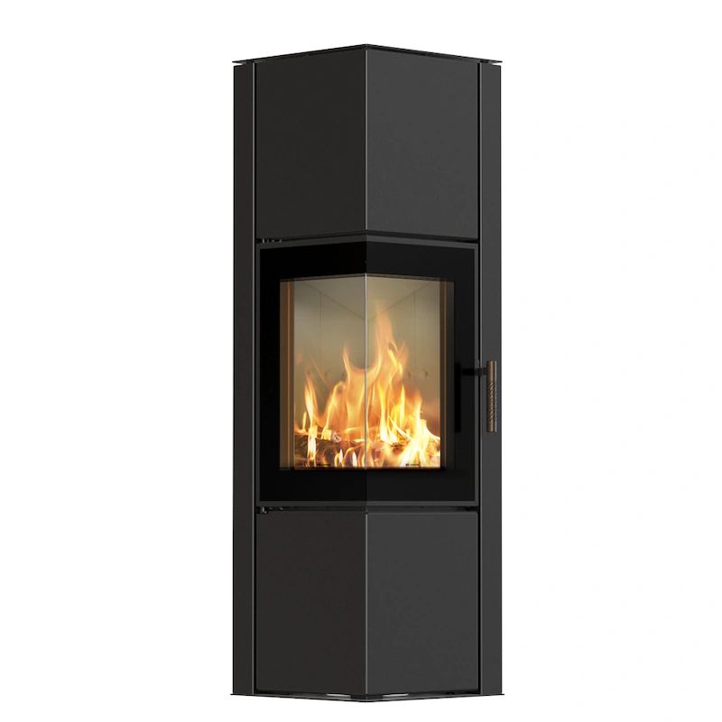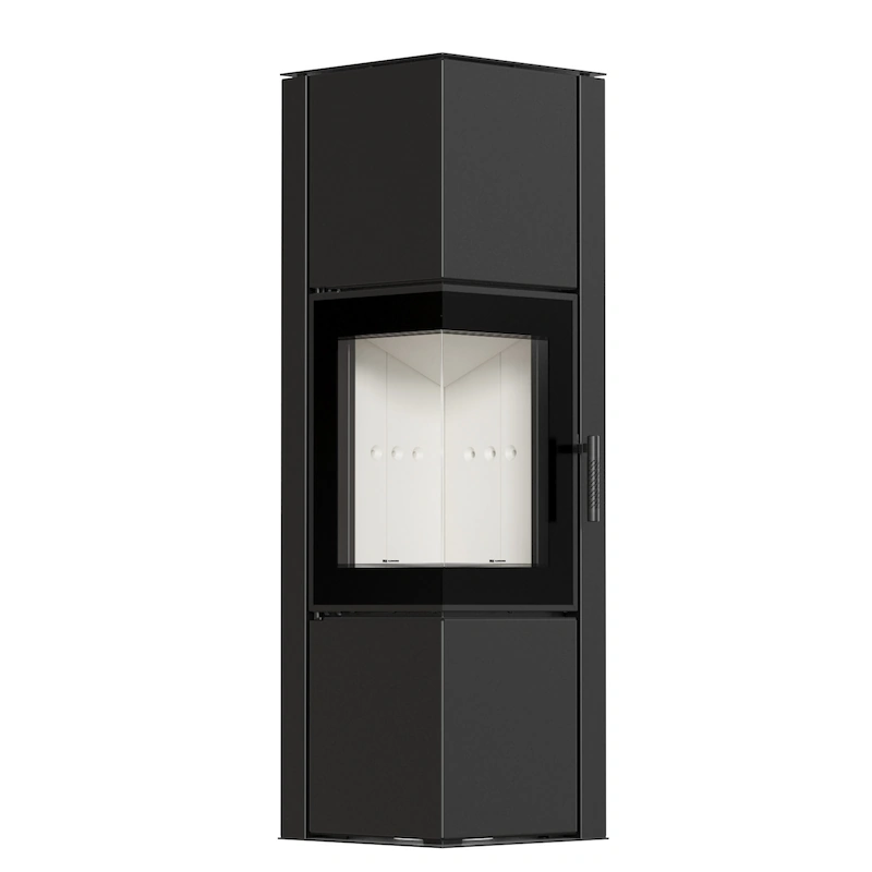 Ocelová dvouplášťová konvekční kamna. Rohová kamna s rámečkem kolem dvířek a větším dekorativním sklem vhodná pro nízkoenergetické nebo dobře utěsněné domy s rekuperací.