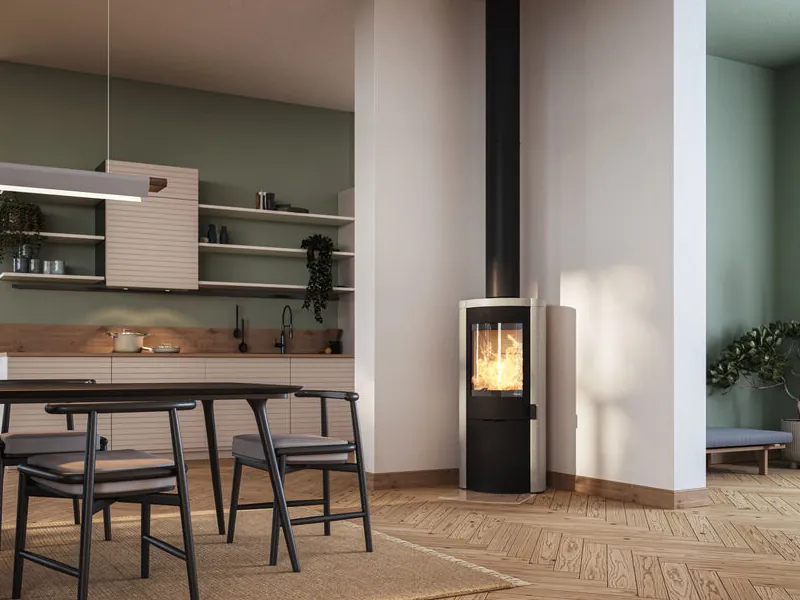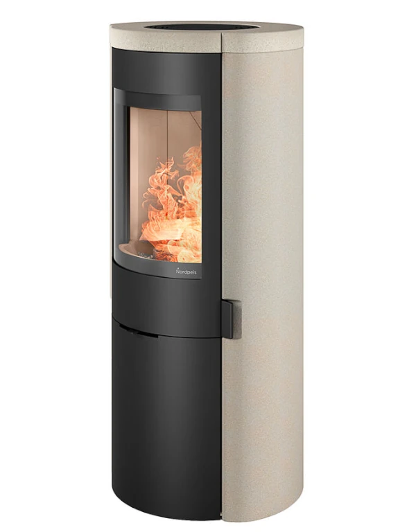 Norská konvekční krbová kamna mají štíhlý válcový tvar severského stylu s velkým prosklením a s obkladem ze speciálního betonu Colorado.
