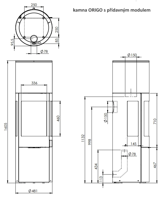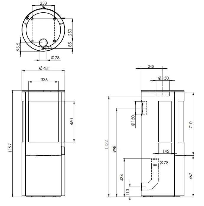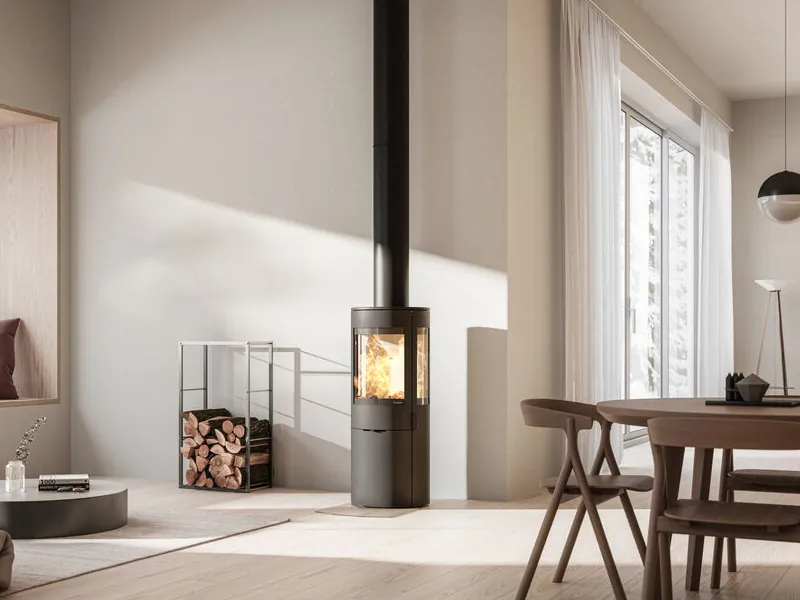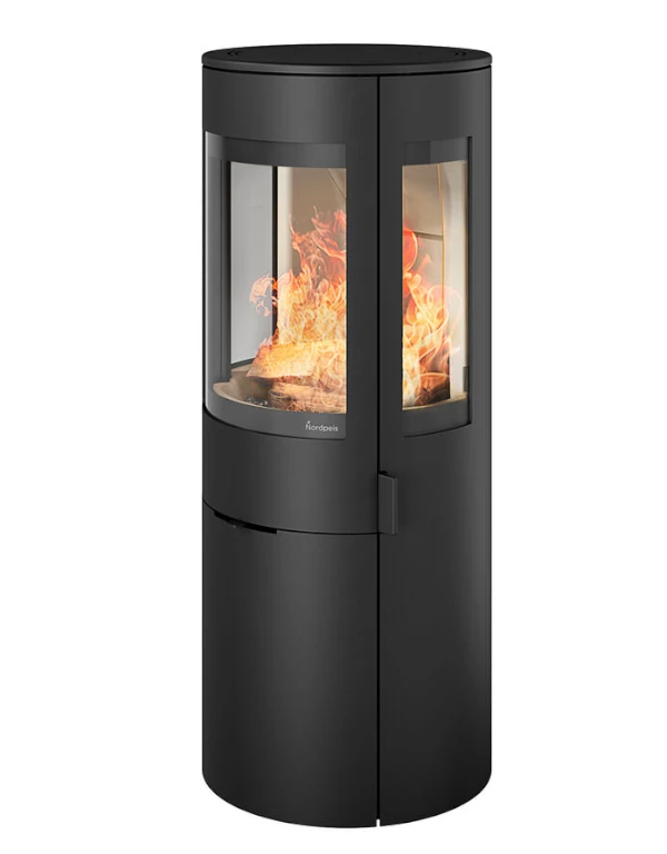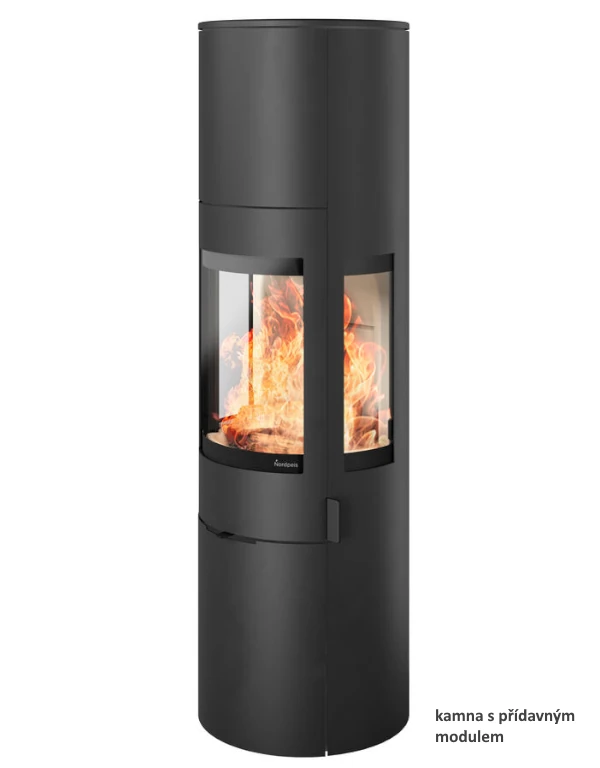 Norská konvekční krbová kamna mají štíhlý válcový tvar severského stylu s velkým předním a bočním prosklením.