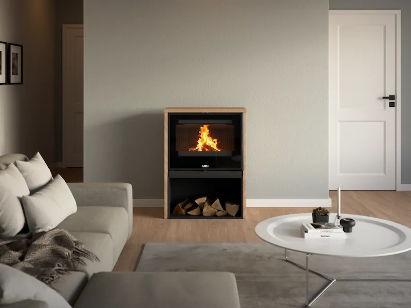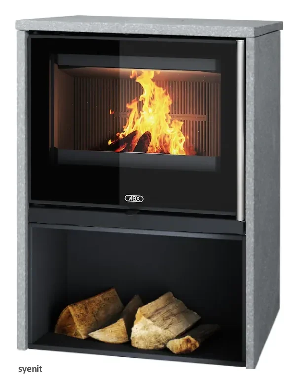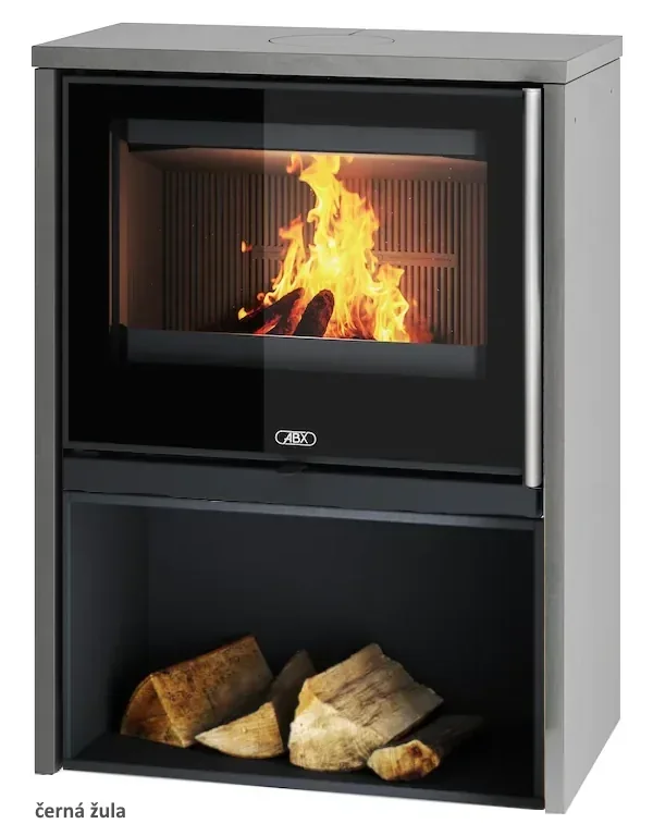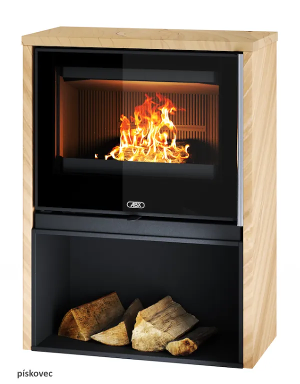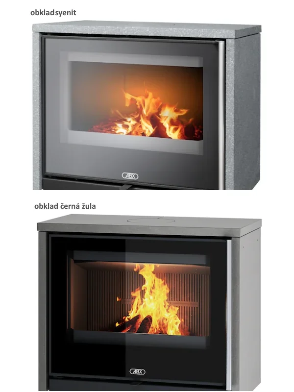 Dvouplášťová teplovzdušná (konvekční) kamna s obkladem z přírodního kamene.