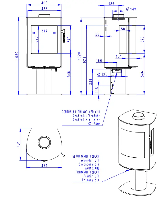 Dvouplášťová (konvekční) krbová kamna s třístranným prosklením na otáčecí noze. Jaký je rozdíl mezi sáláním a konvekcí ![]()