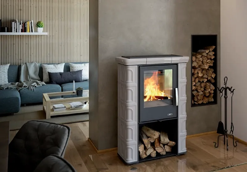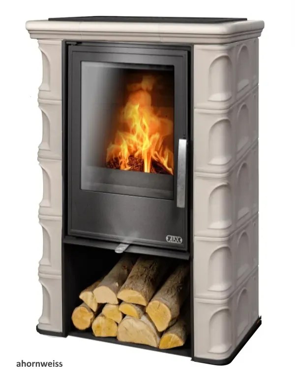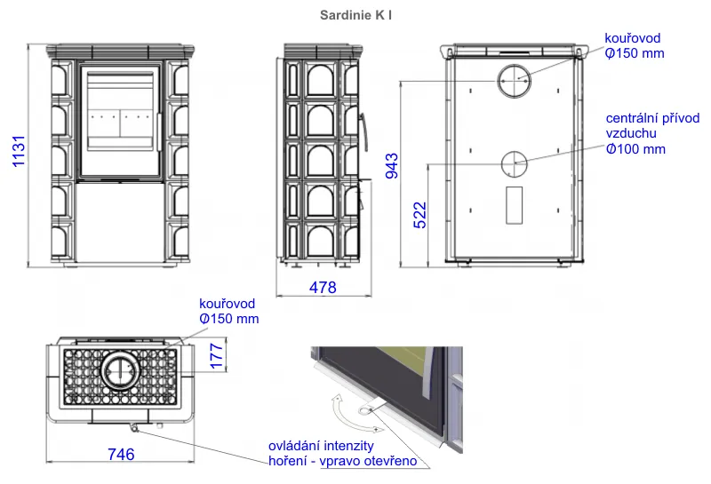Kachlová dvouplášťová teplovzdušná (konvekční) kamna. Topeniště je plechové s litinovými dvířky a vyložené šamotem.