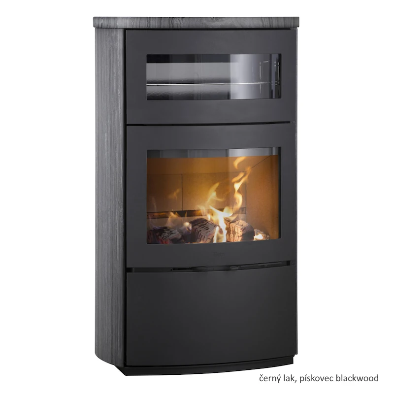 Dánská konvekční krbová kamna na dřevo s pečící troubou a s velkým prosklením pro polena dlouhá až 60 cm.