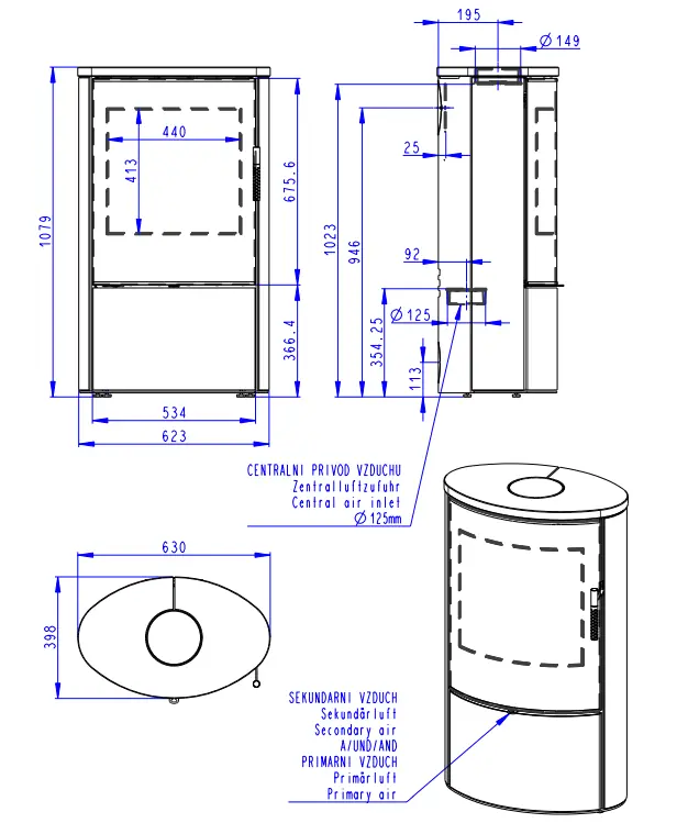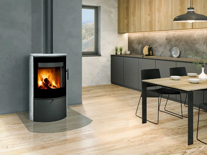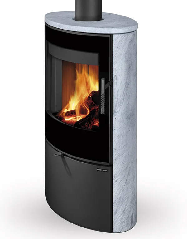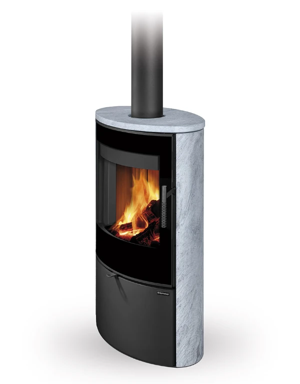 Dvouplášťová (konvekční) krbová kamna elegantního oválného designu s kamenem. Designové potištěné sklo překrývá celou plochu dvířek.