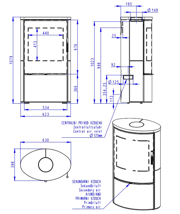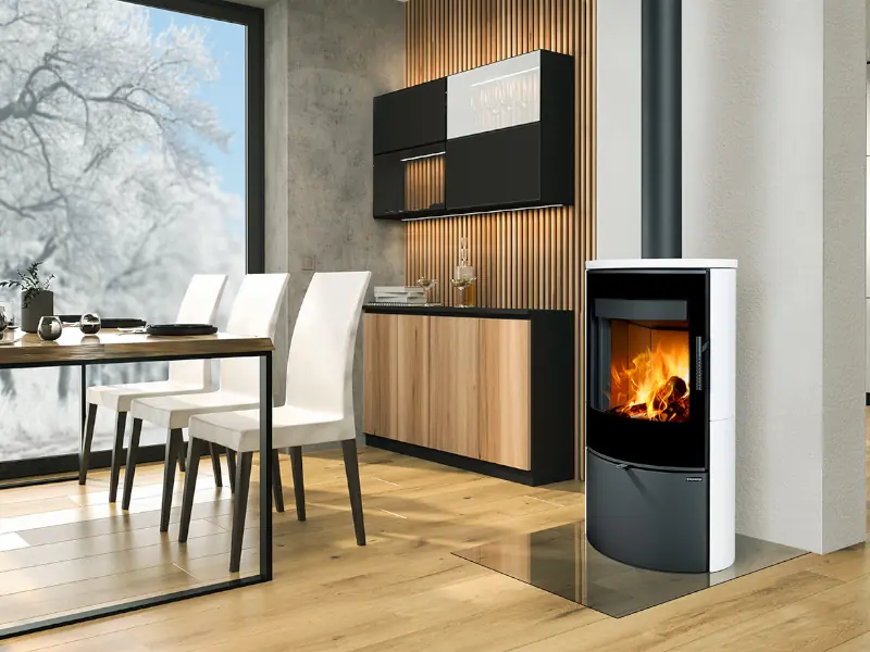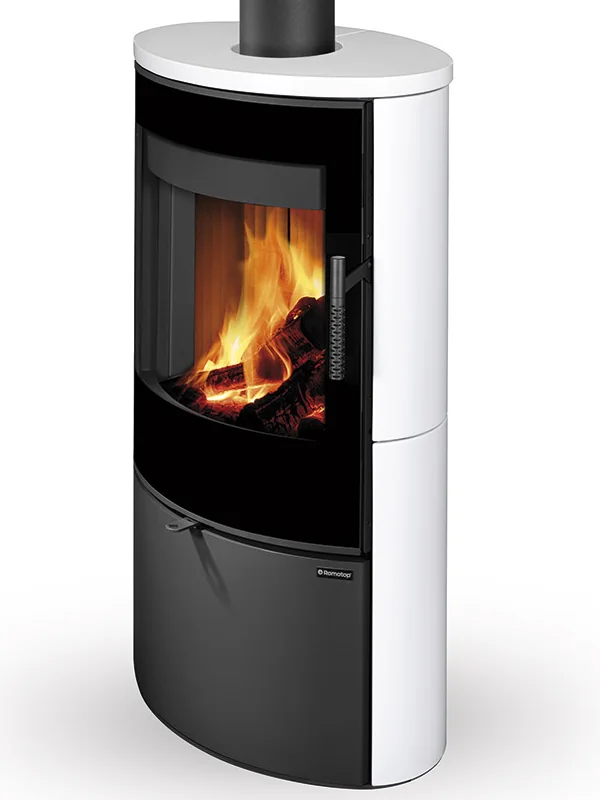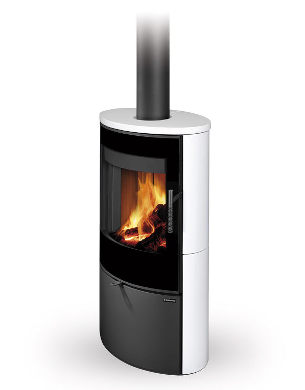 Dvouplášťová (konvekční) krbová kamna elegantního oválného designu s hladkou keramikou. Designové potištěné sklo překrývá celou plochu dvířek.