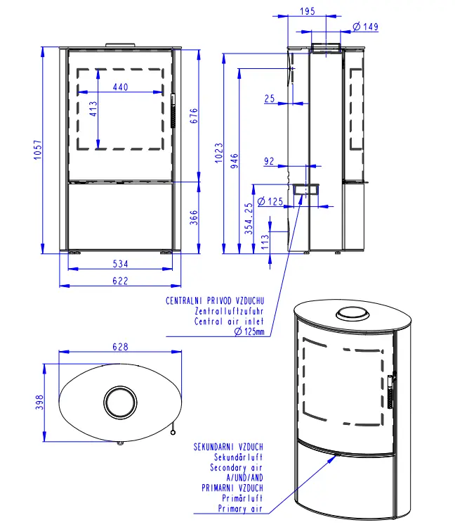 Dvouplášťová (konvekční) krbová kamna elegantního oválného designu. Designové potištěné sklo překrývá celou plochu dvířek.