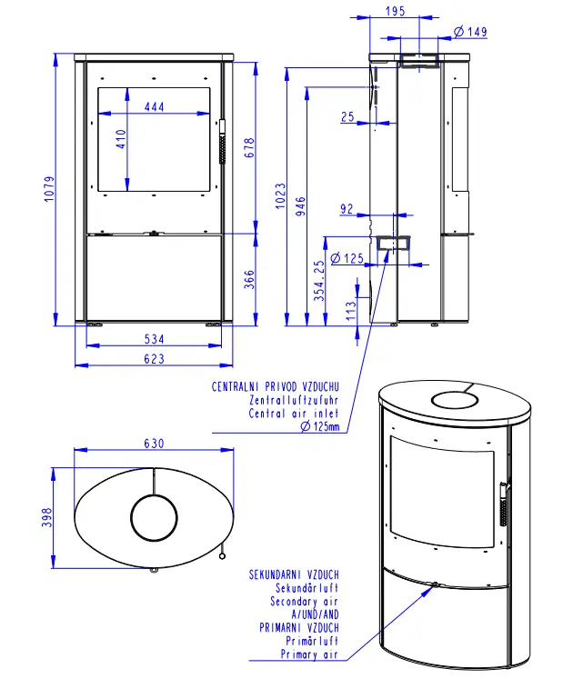 Dvouplášťová (konvekční) krbová kamna elegantního oválného designu s kamenem.