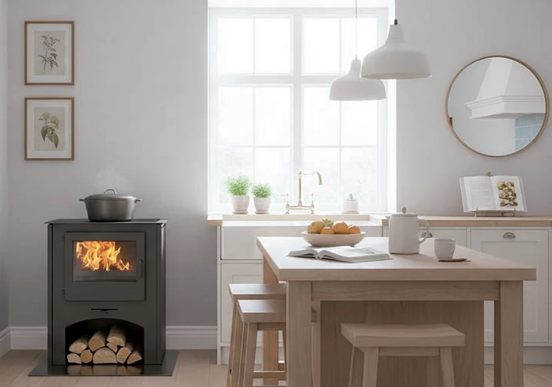 Kuchyňský sporák bez trouby s ocelovou deskou. Ocelový plášť s černým lakem a topeniště se šamotovou vyzdívkou.