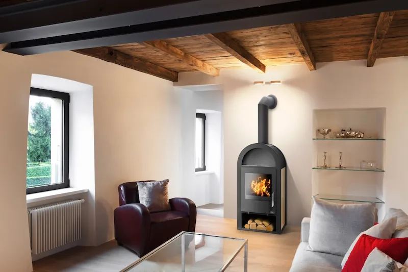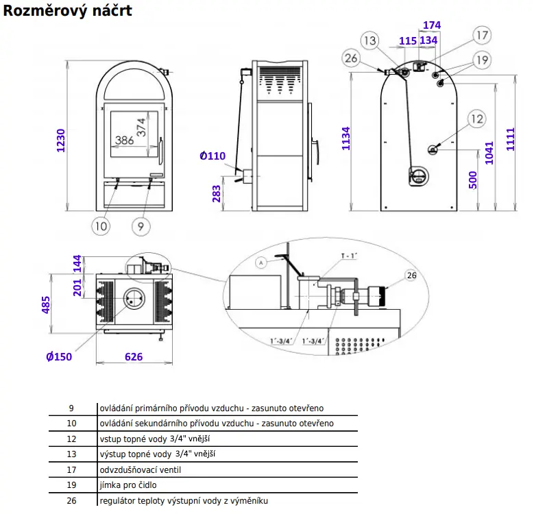Dvouplášťová teplovzdušná (konvekční) kamna s teplovodním výměníkem. Ocelový korpus, keramický obklad, vermikulitová vyzdívka topeniště. Dvojité spalování.