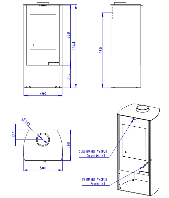 Dvouplášťová (konvekční) krbová kamna s rovnými dvířky a s ocelovým opláštěním. Jaký je rozdíl mezi sáláním a konvekcí ![]()