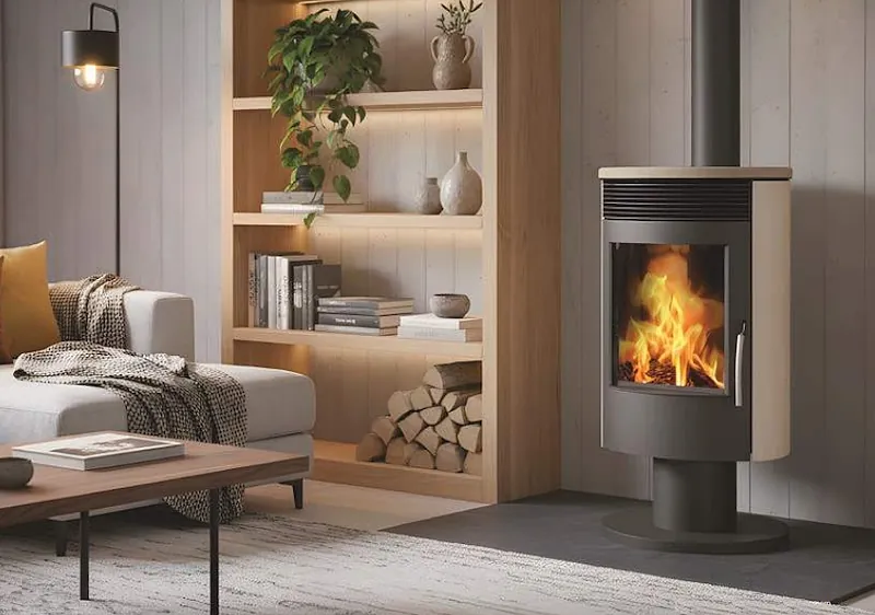 Dvouplášťová teplovzdušná (konvekční) kamna na elegantní noze.