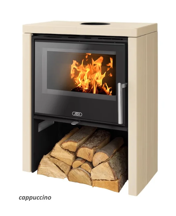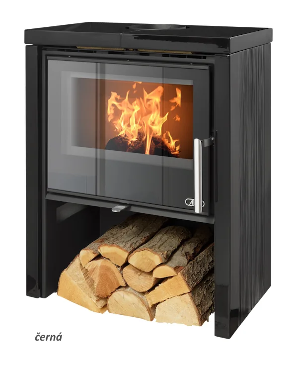 Dvouplášťová teplovzdušná (konvekční) kamna s kachlovým obkladem a s celoskleněnými dvířky.