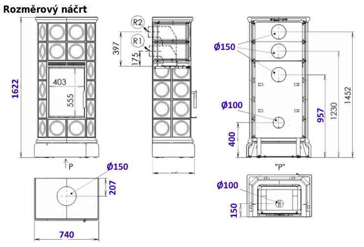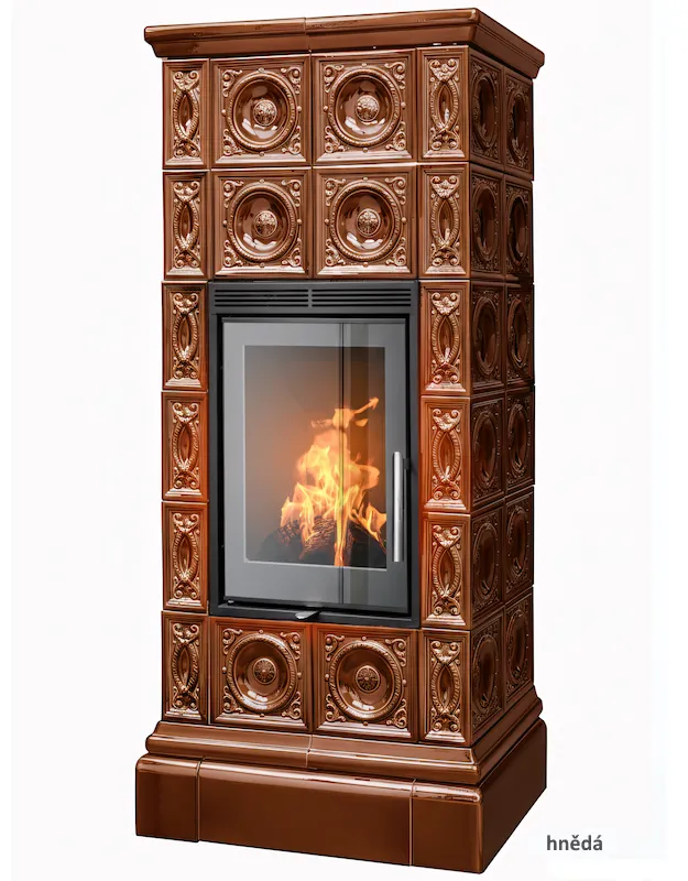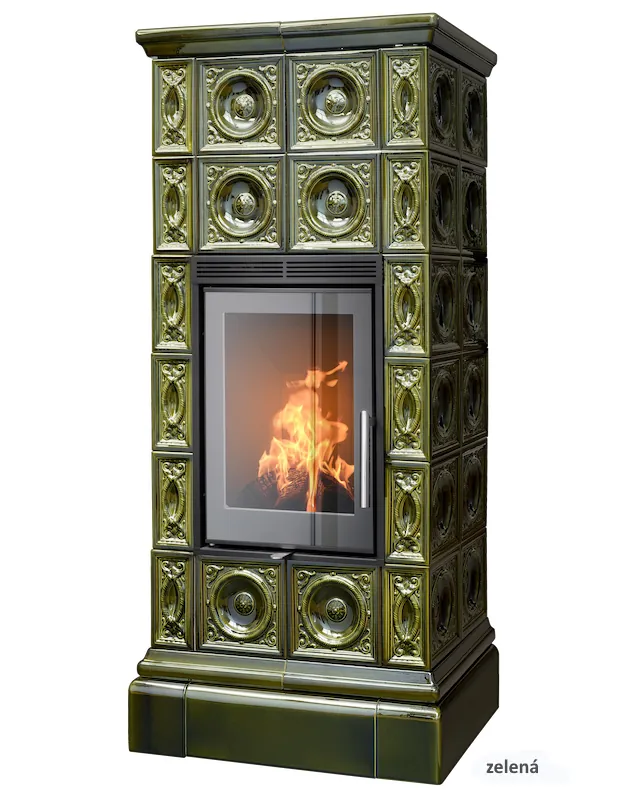 Kachlová dvouplášťová teplovzdušná (konvekční) kamna s celoskleněnými dvířky.