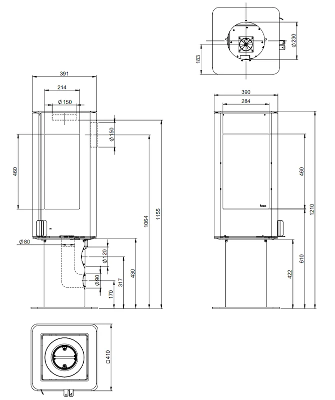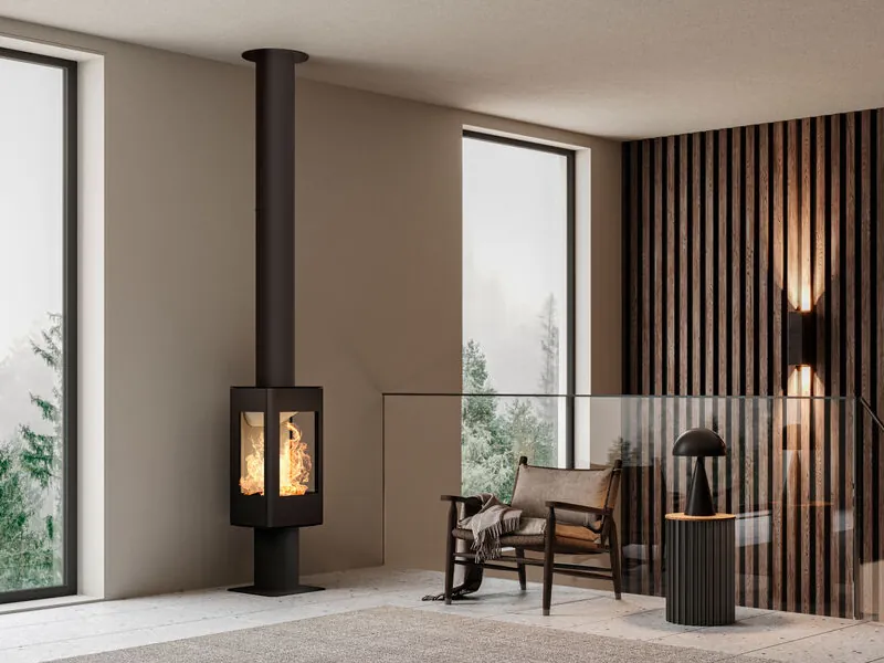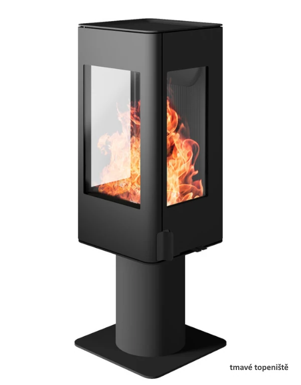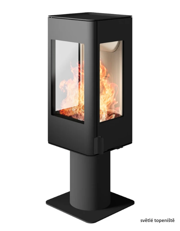 Norská konvekční krbová kamna na elegantní noze s vysokým topeništěm a třístranným prosklením.
